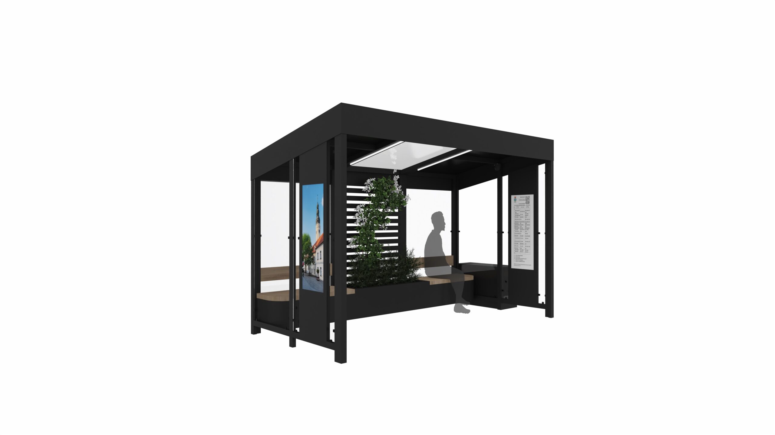 Smart City Bus Stop to innowacyjny przystanek autobusowy zasilany energią słoneczną. Oferuje ładowanie urządzeń, podświetlany rozkład jazdy i monitoring, poprawiając komfort i bezpieczeństwo pasażerów. Wbudowana donica na rośliny oraz pojemnik recyklingowy sprawiają, że przystanek jest ekologiczny. Ponadto, dzięki podświetlanej gablocie miasto zyskuje atrakcyjną powierzchnię reklamową. Przystanek można wyposażyć w system monitoringu, co podniesie poziom bezpieczeństwa pasażerów i umożliwi nadzór miejskich przestrzeni.